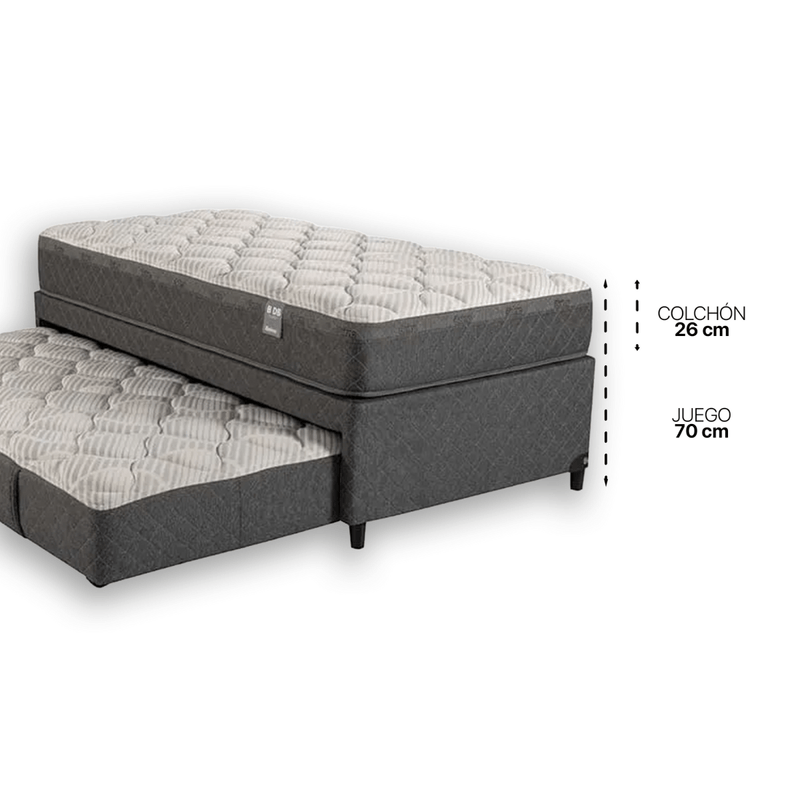 El modelo DuoBed se compone por Sommier de estructura reforzada con espacio para el guardado de su colchón carrito con ruedas incorporadas. Colchón de Resortes Bicónicos con Estabilizadores de Espuma de Polietileno Perimetral y Marco Perimetral de Espuma de Poliuretano Extra Firme. Posee un Tapizados en tejido de punto de algodón y Tela de Jacquard en composé.