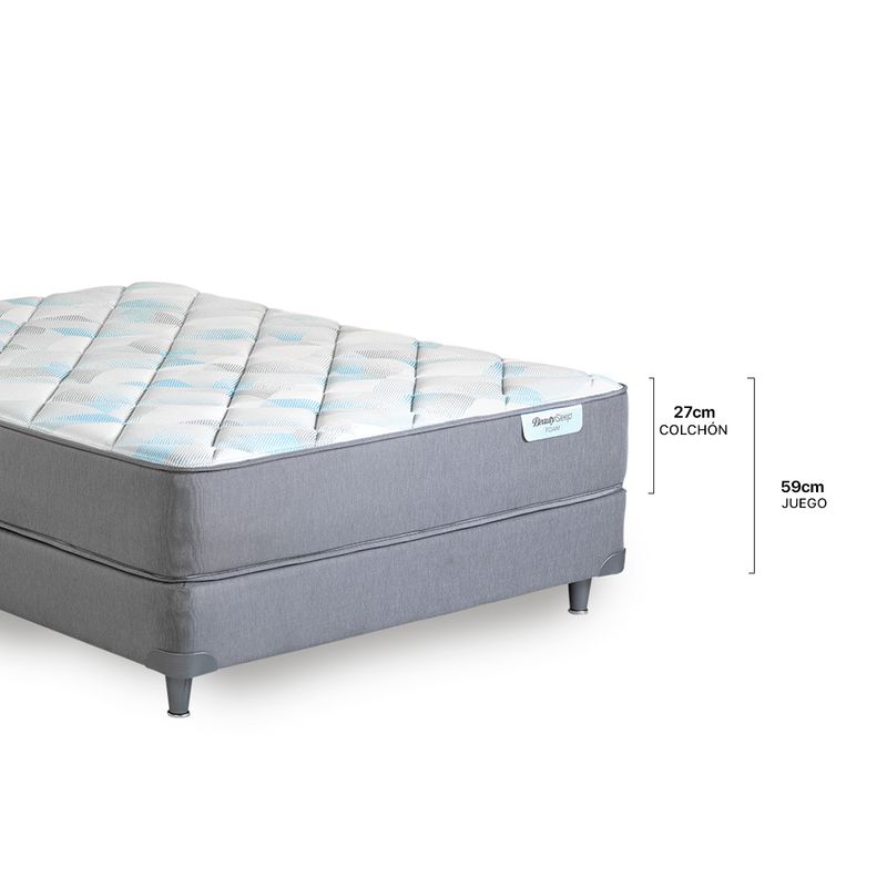 El colchón, con una estética moderna y simple, es el modelo ideal para todos aquellos que buscan tener una superficie firme para la postura de la columna al descansar. Su estructura se compone de un bloque de Espuma de alta densidad HD Foam de 33 kg/m³ que se adapta a la forma del cuerpo otorgando un soporte uniforme, combinado con Espumas Energy precomprimidas que brindan un confort inalterable y disminuyen el hundimiento causado por el cuerpo (body impression). Tapizado en telas de tejido de punto que componen un diseño especial, combinando la tapa, los laterales y el sommier.